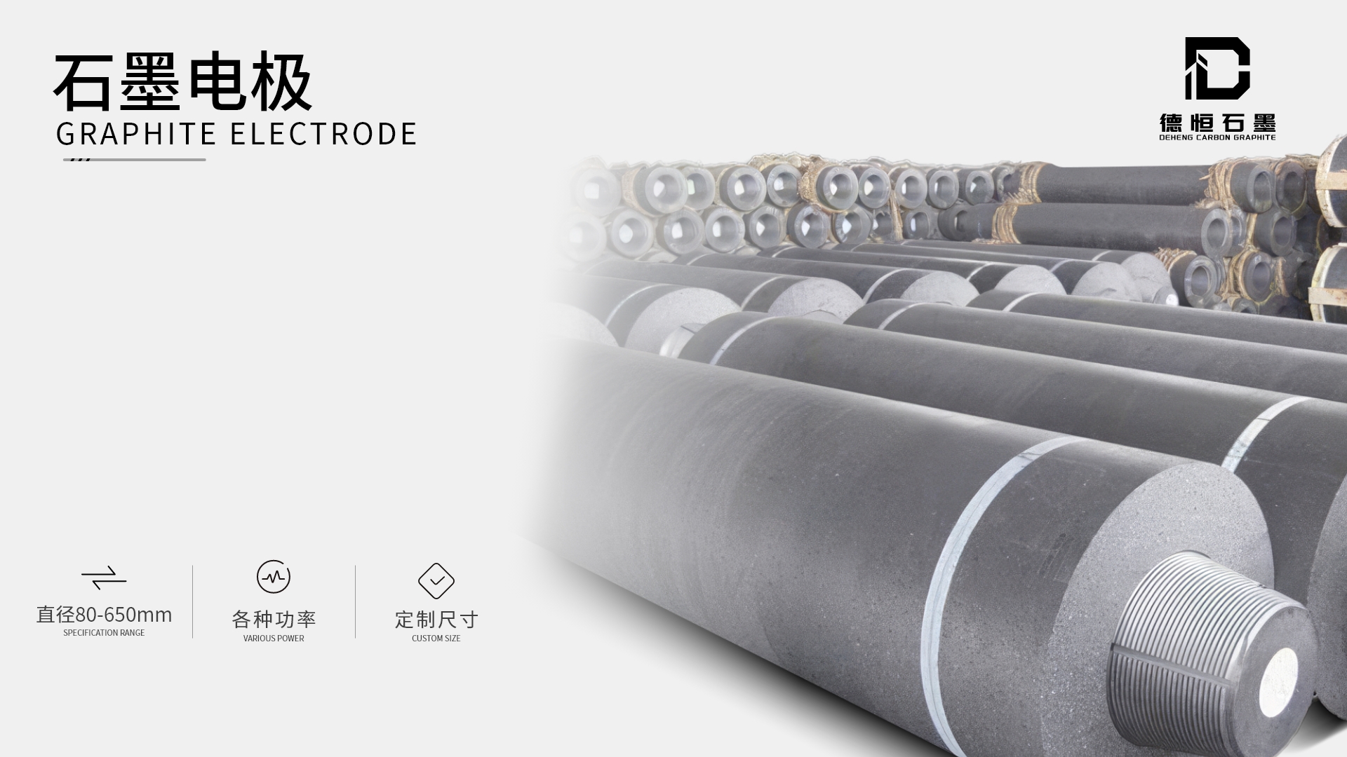 电极型号直径80-650mm,分为普通功率,高功率和超高功率。支持特殊尺寸定制。